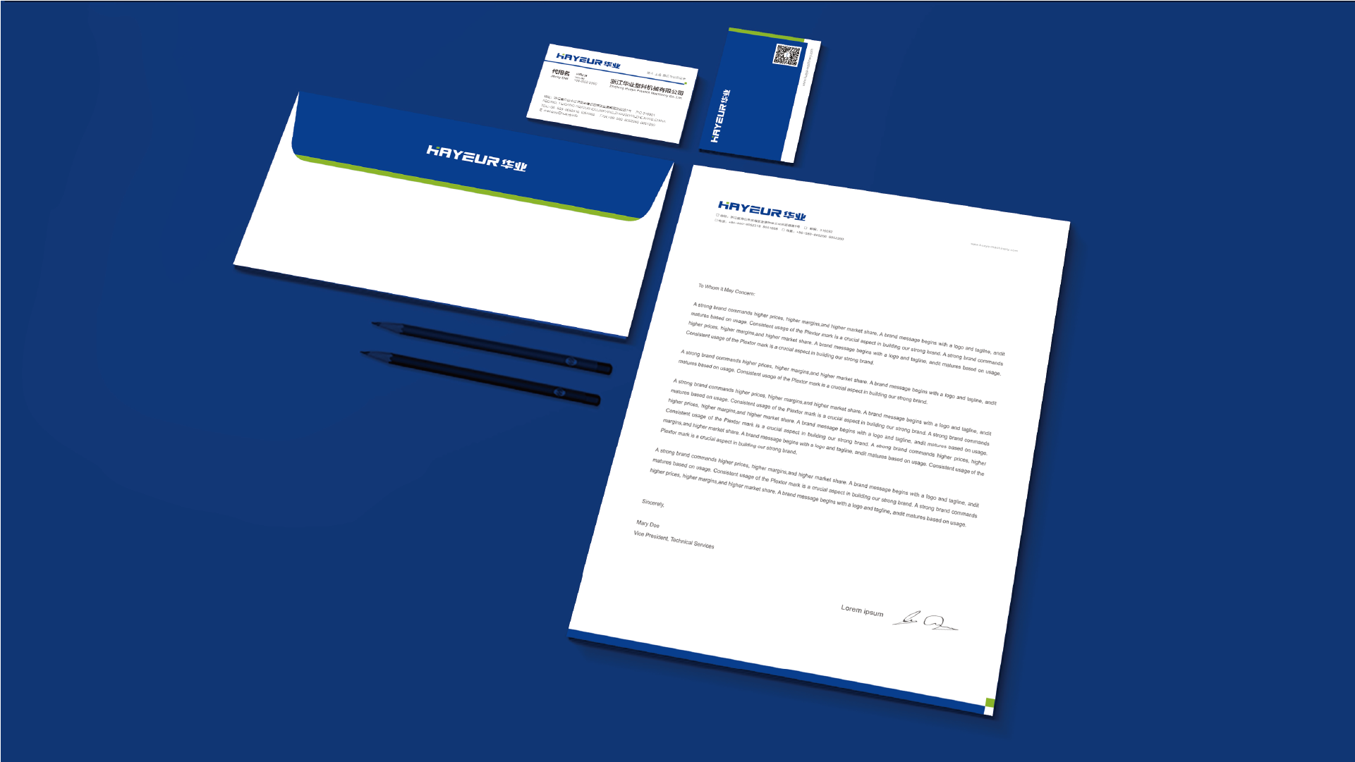 和與德在品牌設計中,通過色彩的精準使用,突出華業塑料機械持續創新、積極進取的企業精神,將浙江華業塑料機械有限公司的服務宗旨、行為和功能傳送給社會公眾,具有突出浙江華業塑料機械有限公司服務的功能,起到強化品牌形象的作用。