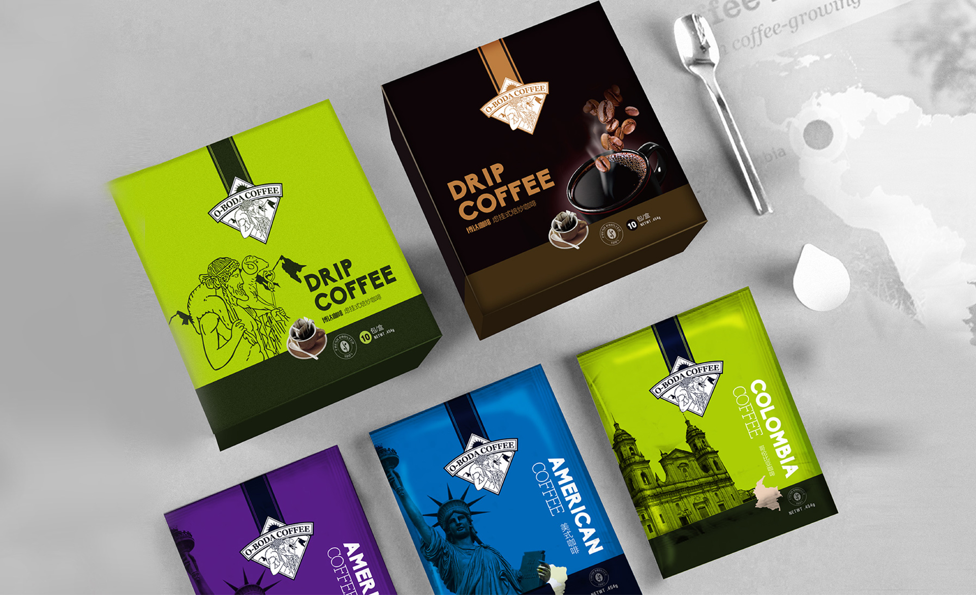 博達咖啡主打輕奢進口的咖啡粉,咖啡豆均源自牙買加,墨西哥,古巴,夏威夷等盛產咖啡豆的地方,其品類多且臻貴,是一個集融合全球81種臻稀咖啡品質的咖啡品牌。和與德結合全球咖啡豆產源地的自然和人文特色,作為包裝的主要設計亮點,其顏色也根據地區特色進行分類,整體包裝質感高級,特色鮮明。
